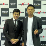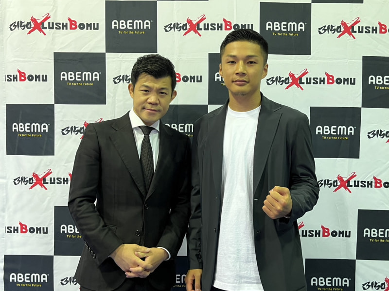 選手契約した宮川竜成(右)と亀田興毅ファウンダー(左)