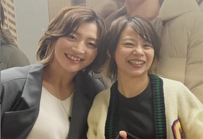角田夏実(左)と高木菜那、仲良し2人が巴投げに発展!(@nana.takagi)