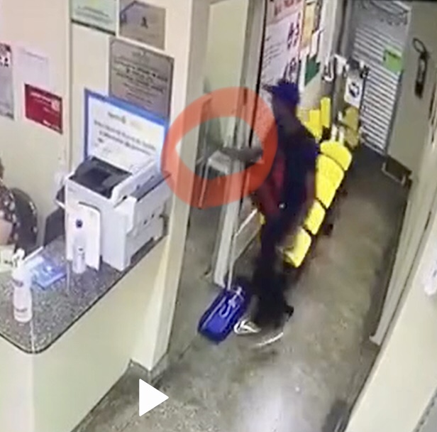 銃をつきつける強盗(emtempo紙動画より)※印は銃