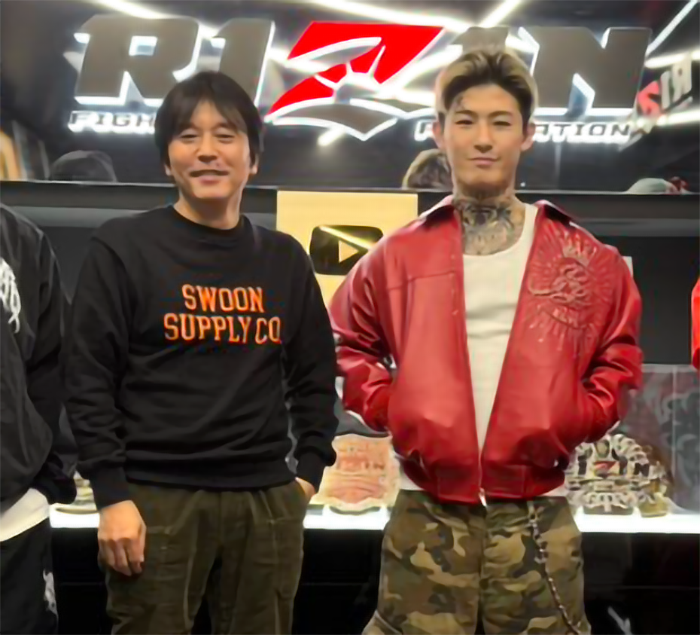 今月に投稿されたRIZIN事務所の記念撮影。RIZINの笹原氏と平本。大晦日参戦の噂も(@renhiramotoXX)