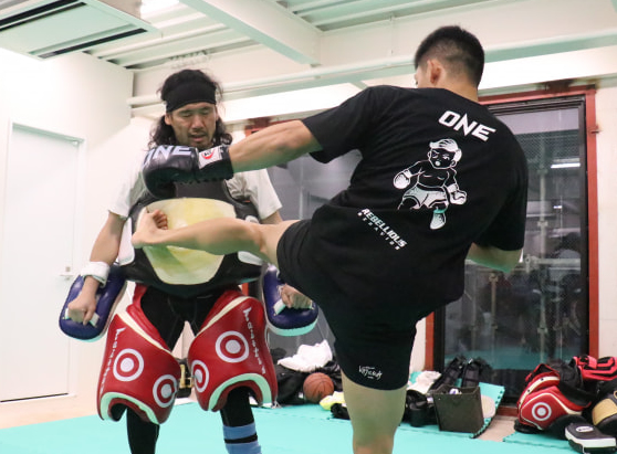 野杁の強烈なミドル!流石の渡辺トレーナーも顔も歪む