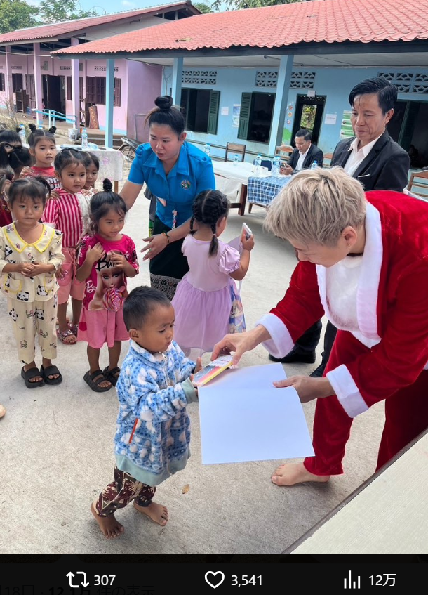 武尊はサンタクロースの姿でラオスの子どもたちにクリスマスプレゼントを渡した(@takerusegawa)
