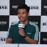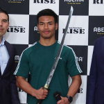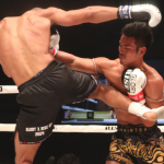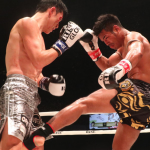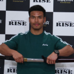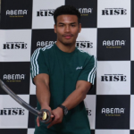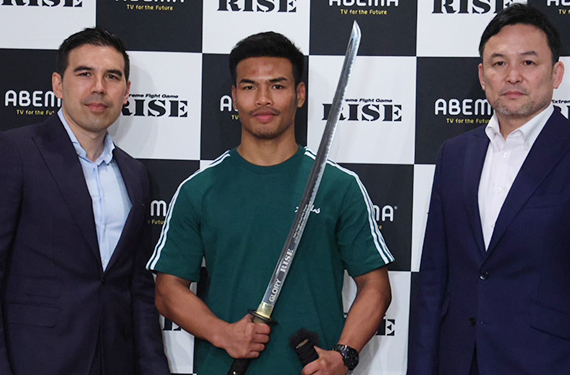 一夜明け会見に出席したペッチ(中央)、GLORYマッチメイカーのロビー・ティアーズ氏(左)、RISE伊藤隆代表(右)