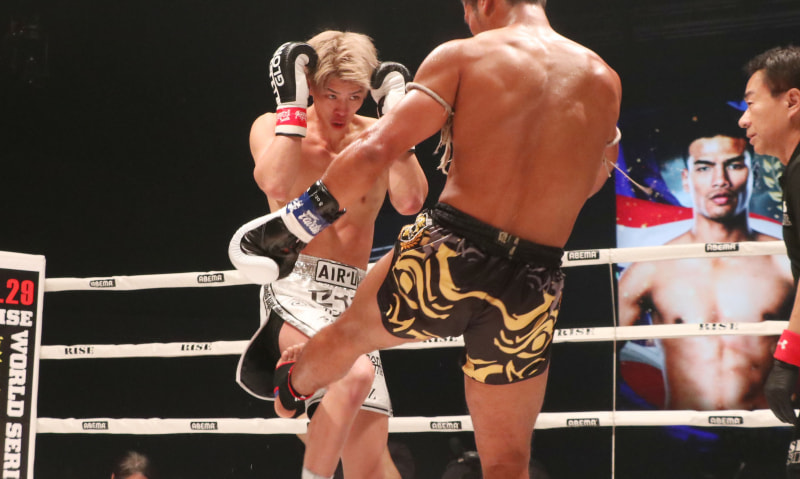 ペッチ(右)のローキックを受ける白鳥大珠(左)