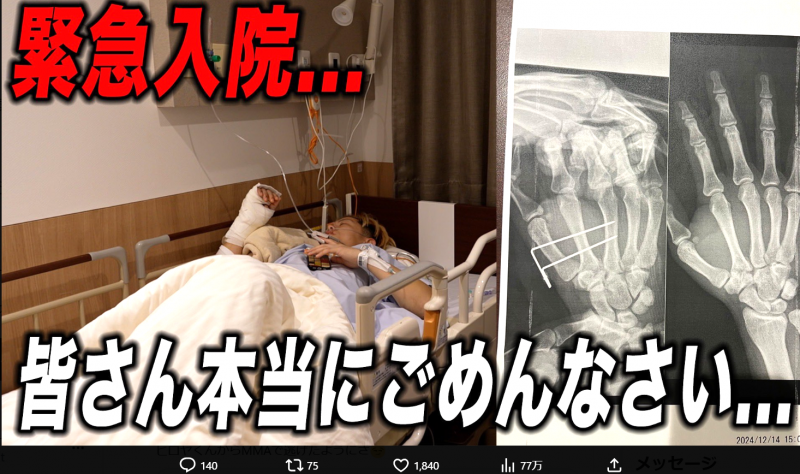 井原は右拳を粉砕骨折し手術をしたことを明かした(@ihararyotaro)