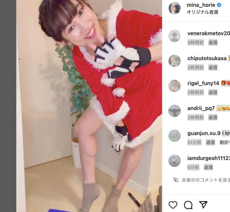 最後に「福が訪れますように」とふくらはぎを見せて「ハッピーメリークリスマス」と手を振った(@mina_horie )