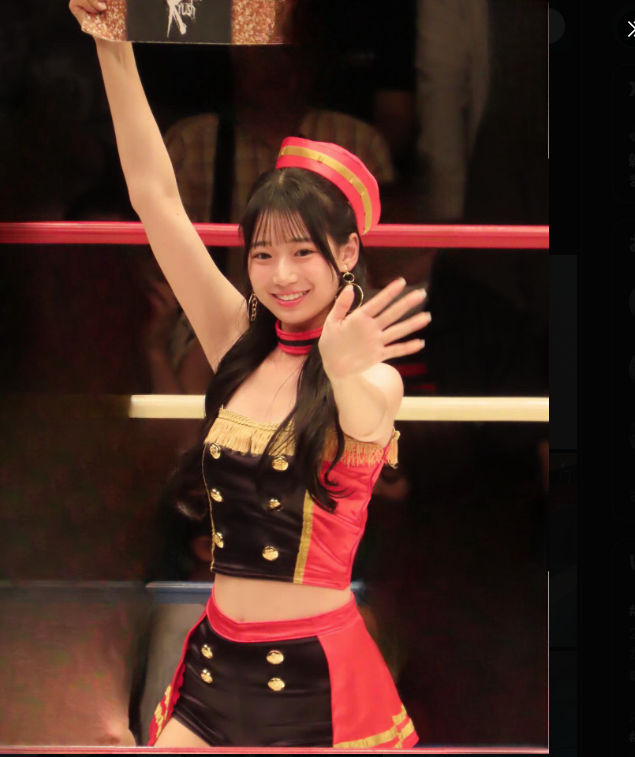 いつものラウンドガール衣装で手を振る(@shiori819)