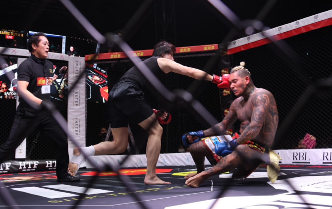 溝口COOの強烈なパンチがヒット!ラッパーSATORUはダウン