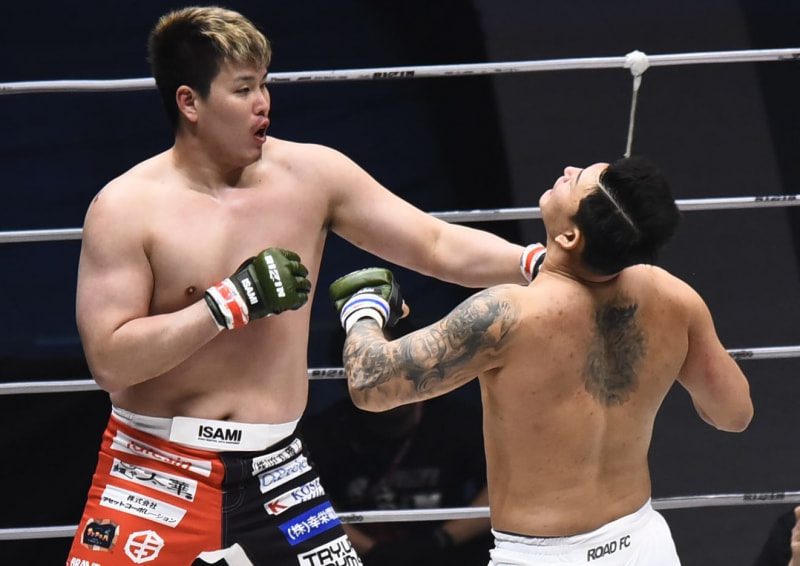上田の左のパンチで顎を上げる
