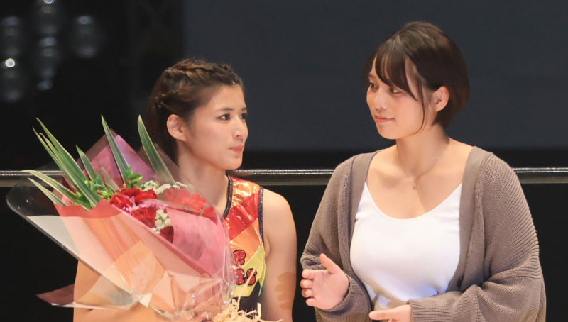 女子高生レスラー山岡聖怜(左)のデビュー戦にミスヤンマガの姉山岡雅弥(右)が花束贈呈でリングイン