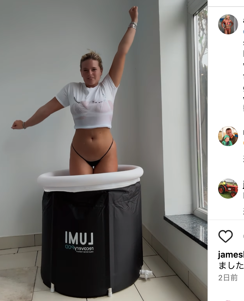 氷風呂チャレンジ、笑顔でポーズ(@apolloniallewellynより)