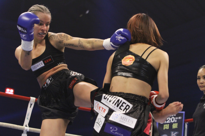 菅原美優(右)にキックで反撃するルーシー(23年12月)
