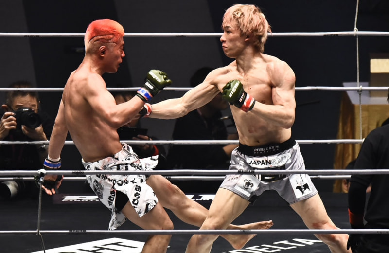 大晦日、強烈なパンチで攻める五明(右)、赤田(左)は顔から流血