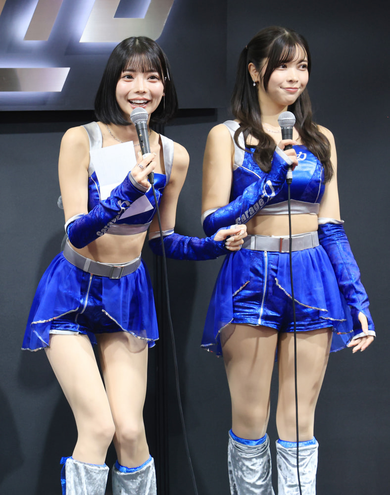米倉みゆ(左)ミニのレースクイーン衣装でトークショー出演