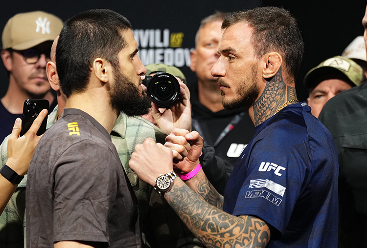 王者イスラム・マカチェフ(左)とへナート・モイカノのフェイスオフ©️UFC