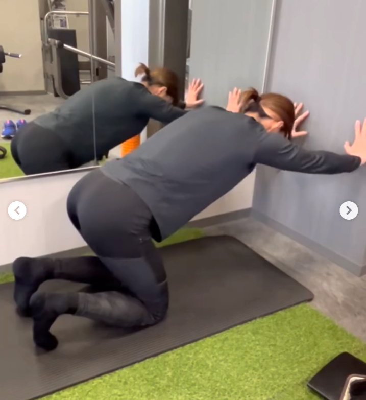 目の前の壁に両手を同時に移動。床へ同時に両手を戻して同じ動作を何回も繰り返す(@tsunoda_natsumi)