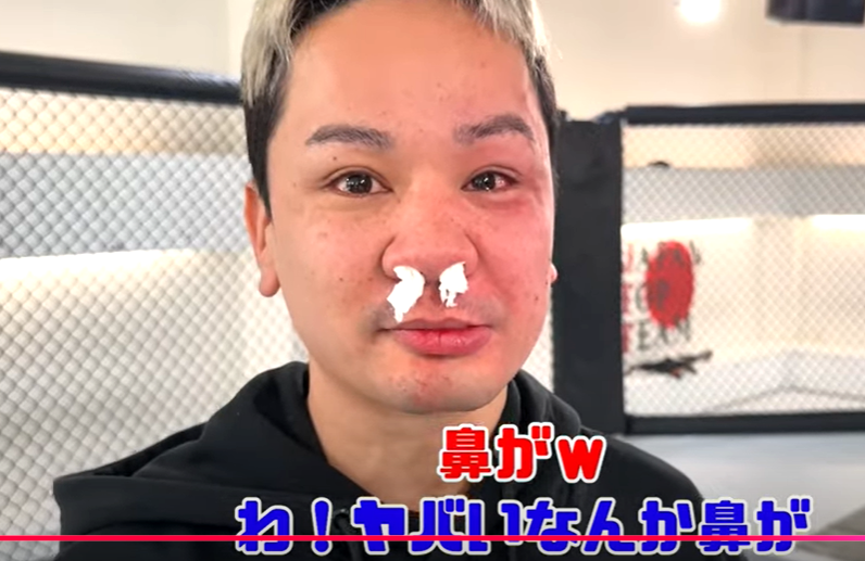 しょーたのビンタで鼻や頬から出血するせーや(『朝倉未来YouTubeチャンネル』)