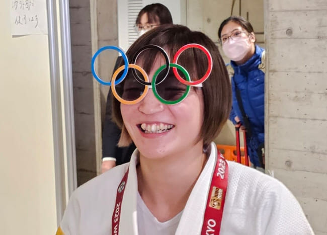 角田が五輪のサングラスをかけて笑顔。23年12月のGS東京の舞台裏にて。すでに金メダルのイメージができていたかのよう