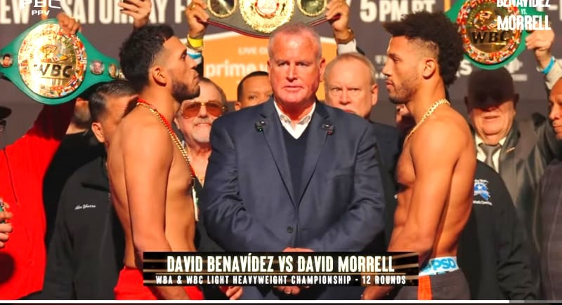ベナビデス(左)とモレル(右)がバチバチの睨み合い!(PremierBoxingChampionsのYouTubeより)