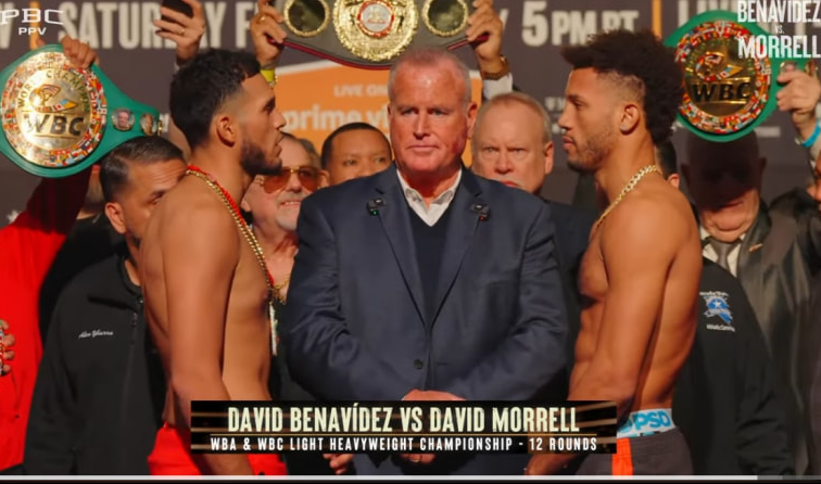 フェイスオフ、何やら言葉を交わしている様子の2人(PremierBoxingChampionsのYouTubeより)