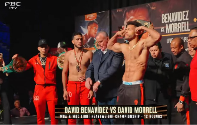フェイスオフが終わってもモレルを睨み続けるベナビデス(左)(PremierBoxingChampionsのYouTubeより)