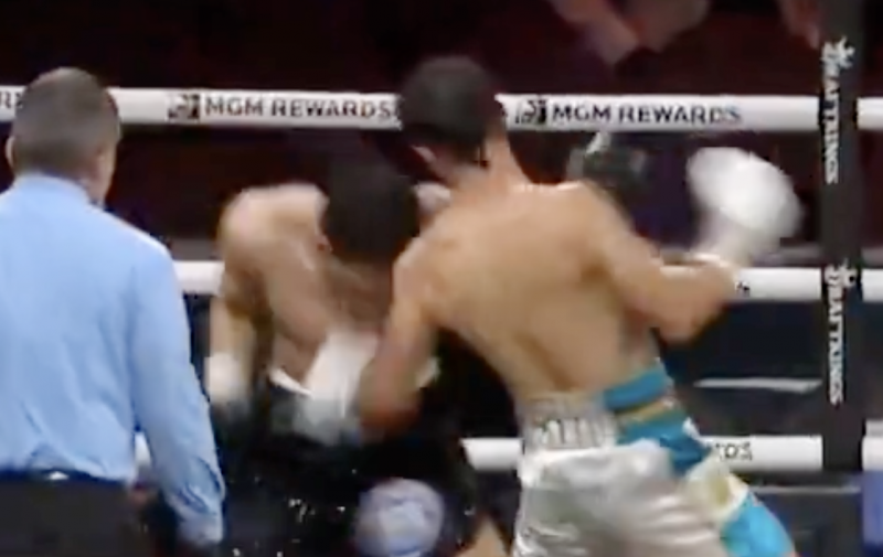 再開後、すぐに左ボディでミルコがダウンを奪いKO!アッパーにも見える(PBCXより)