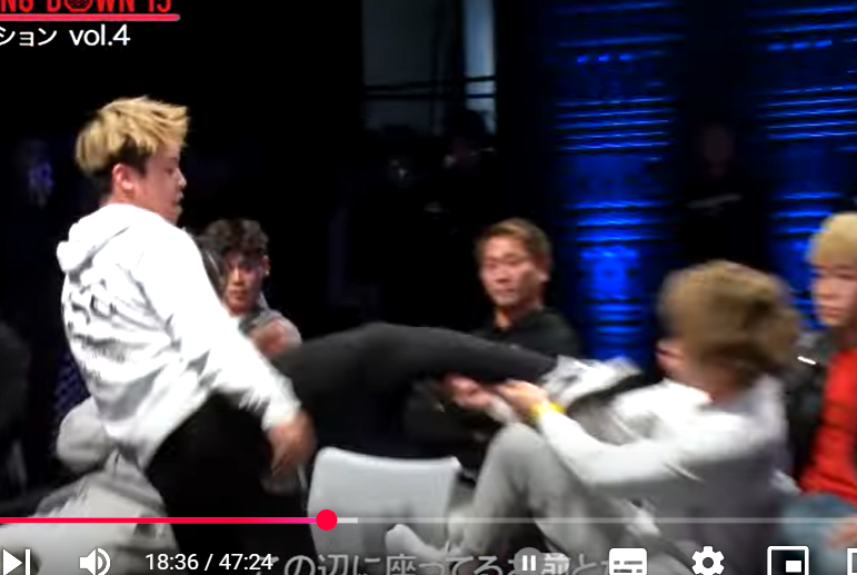 前蹴りで吹っ飛ばし乱闘騒ぎを起こすあやと(『朝倉未来』YouTubeチャンネル)