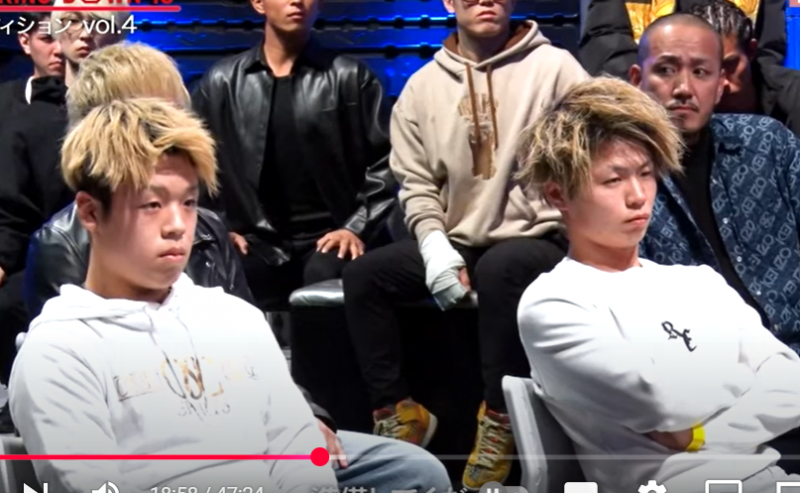 あやと(左)は、隣に座る参加者と乱闘騒ぎを起こしスパーリングへ(『朝倉未来』YouTubeチャンネル)