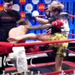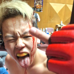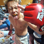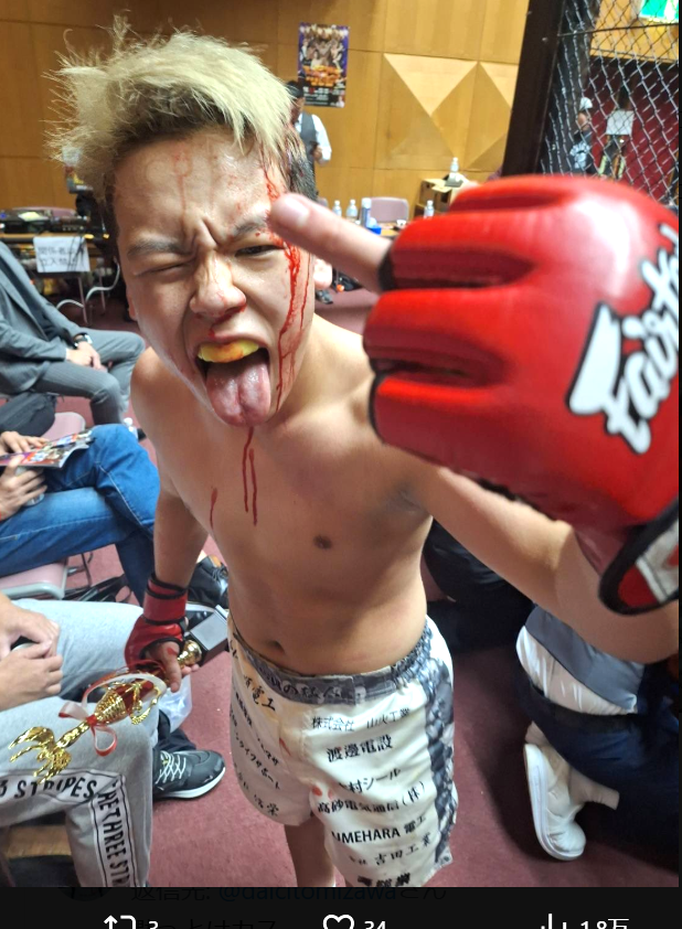 キックボクシングの試合で勝利して流血からの中指ポーズのあやと(@ayato11_2)