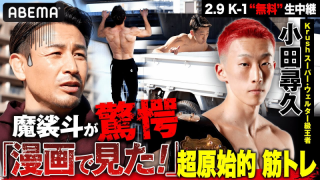 そして、小田は軽トラック(約750kg)を押し引きする変わった特訓へ。小田によると毎日1km、軽トラックを押して引くという。魔裟斗は「昭和だなー。小田君、今、令和だよ。ロッキーじゃん。なにわのロッキー!」とツッコミを入れる場面もあった。