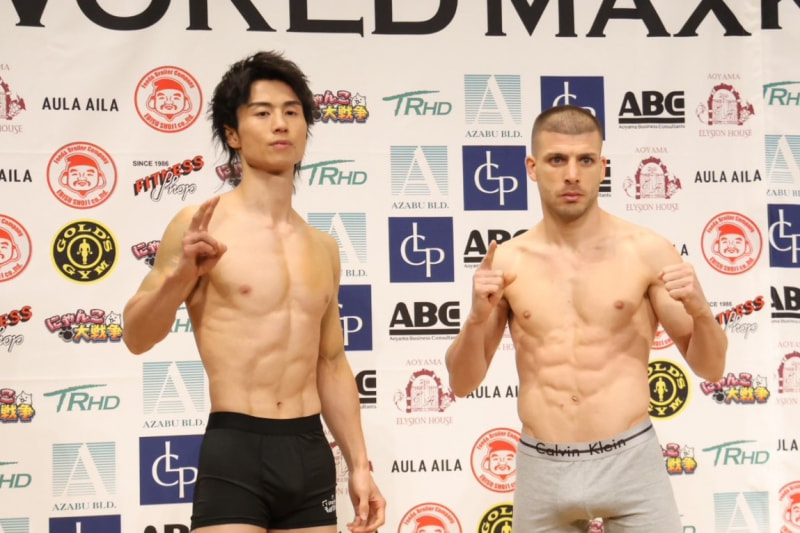 金子晃大(左)がカリスティス(右)を迎えて、3度目の防衛戦