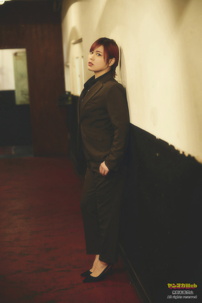 「諜報員」をテーマにしたパンツスーツ姿の舞華(C)高橋慶佑/ヤンマガWeb ▶︎ヤンマガページへ