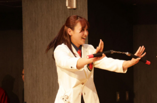 ステージでヌンチャクの基本を安井に教わると、目代は「アチャー」というブルースリーの気合と共にヌンチャクを豪快に振り、最後に決めポーズ。会場からは大きな拍手が鳴り響いた。