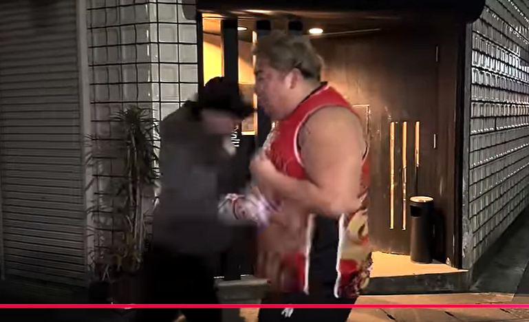 ノッコンのボディに飯田のパンチがめり込む(『飯田将成』YouTubeチャンネル)