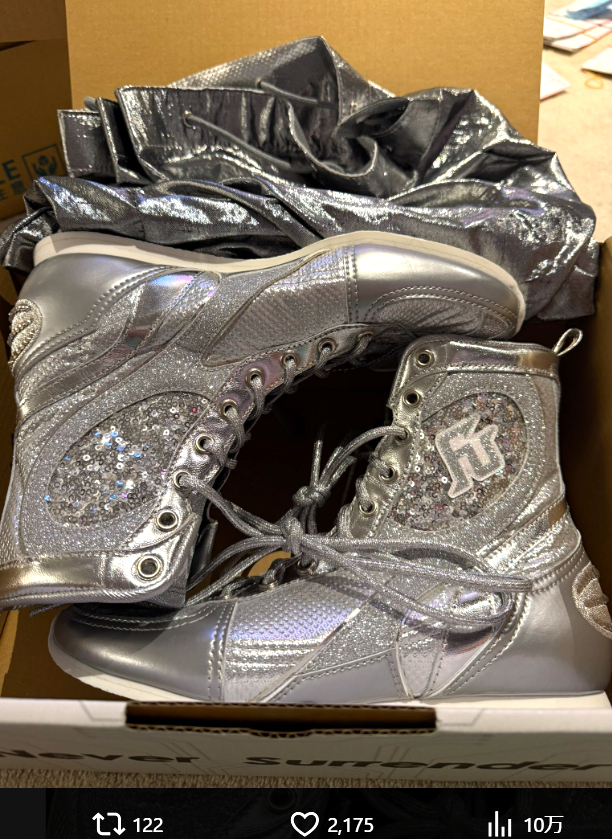 今回のモロニー戦は、ガンメタリック調のシューズを履くようだ(@TeppenTenshin)