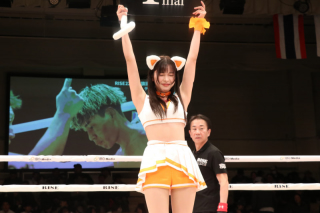 RISEのラウンドガールと言えば、猫耳、尻尾を付けた可愛いミニの衣装でファンを喜ばせているが、大会中に七瀬ななの尻尾が取れるというハプニングが起きていた。七瀬は、取れた尻尾とラウンドボードを手に持ち、恥ずかしがりながらリングを歩いた。
