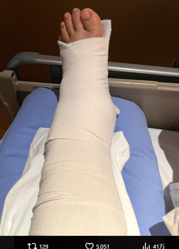 左足の手術を受けたという白川はギプス姿の写真を投稿(@dr55634)