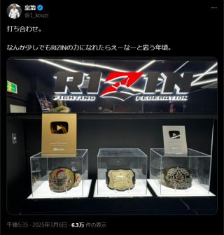 そんな皇治は自身のXに「打ち合わせ。なんか少しでもRIZINの力になれたらえーなーと思う年頃」とRIZIN事務所に置いてあるベルトの写真と共に投稿。次戦の打ち合わせなのかは分からないが、RIZINとの間で何か決まったことがあるのかもしれない。