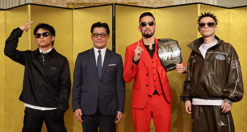 会見に出席した(左から)ヒロヤ、RIZIN榊原信行CEO、クレベル・コイケ、篠塚辰樹
