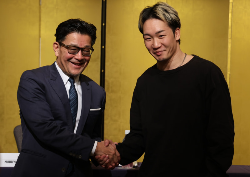 RIZIN榊原代表(左)と握手する朝倉