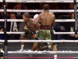 - なぜか反対を向きヒザつき!(PremierBoxingChampions YouTubeより)