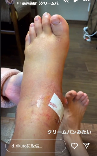 今回の投稿は、おそらく術後のパンパンに腫れ上がっている左足の状態なのだろう。「クリームパンみたい」とコメントし、くるぶしと足の甲の凹凸が分かりにくいほど太く丸く腫れ上がっている写真を公開した。