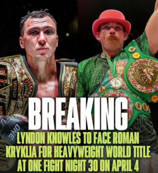 4月5日にタイ・バンコクのルンピニースタジアムで開催される格闘技イベント『ONE Fight Night 30』メインイベントのヘビー級ムエタイ世界タイトルマッチにて、王者のローマン・クリークリャ(33=ウクライナ)がリンドン・ノウルズ(38=英国)を挑戦者に迎え、初防衛戦に挑む。