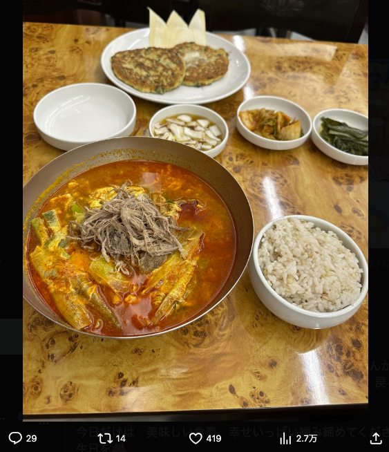 韓国旅行に行った際の料理を載せるぱんちゃん(@panchanrinaより)