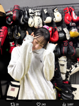 - キックボクシングのスパーリング後の疲れた顔にダブルピース!(@shiori_08.19より)