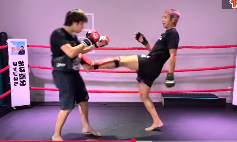 久保のストレートキック。下から真っ直ぐ蹴り上げるようにボディへ入れる(『サラ久保ちゃんねる』)