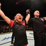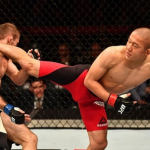 2016年、バガウティノフ(左)に後ろ回し蹴りをヒットさせる堀口(右)