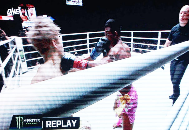 ロッタンの左フックが武尊のアゴに食い込みダウン!