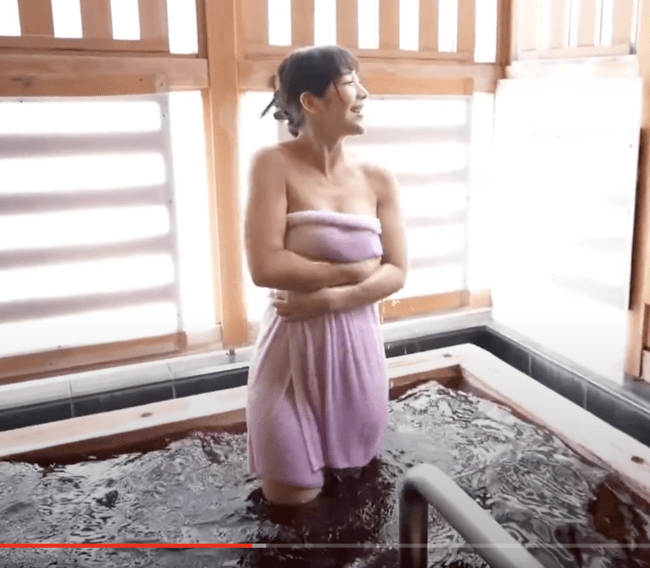 ワイン風呂でタオルを巻いた姿(YouTubeチャンネル『銭湯とサウナとわたし』)