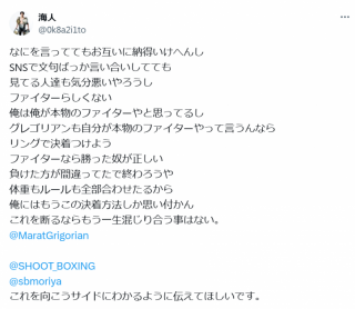 海人の投稿を見たユーザーは「それなら最初から試合受けとけばよかっただけでは…」や「いまさら合わせてやるとか言うのはおそいような…そのセリフがなぜあの時出なかった?」といった否定的な意見が書き込まれたが、「漢の中の漢…良くも悪くも因縁出来たので、試合見たいです!」「格闘家としての強い矜持を見た思いがしました。改めて尊敬します」といった肯定派の意見もあり、真っ向から対立している印象だ。